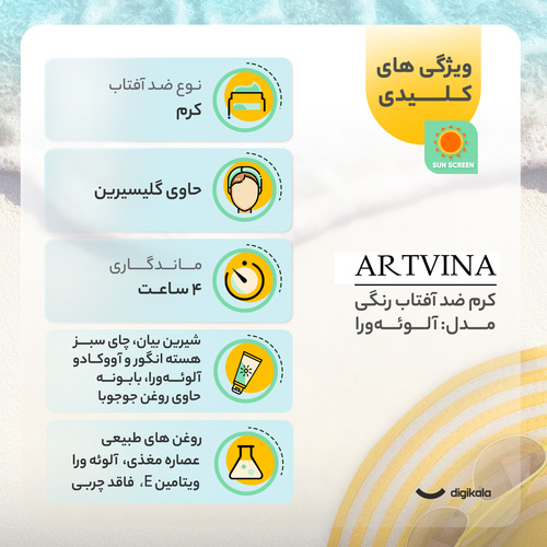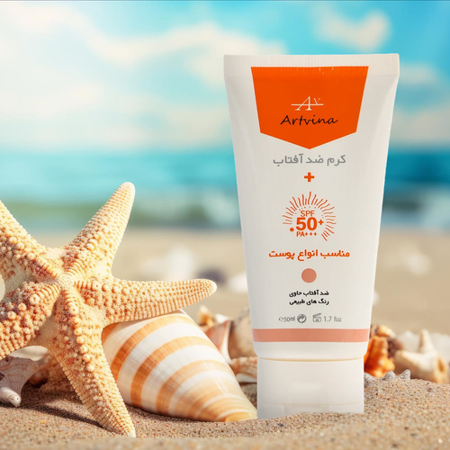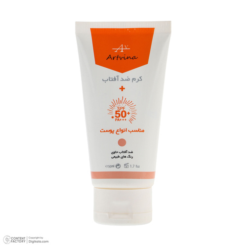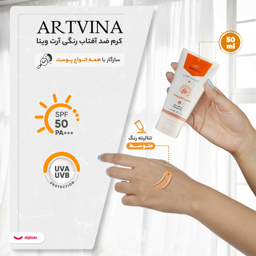 کرم ضد آفتاب رنگی آرت وینا، SPF 50 مدل آلوئهورا مناسب انواع پوست، تنالیته رنگ متوسط، حجم 50 میلیلیتر، حاوی محافظ UVA ،UVB و PA